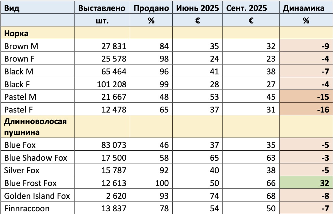 Из 3,8 миллионов предложенных шкурок норки было продано около 90%, а из 281 000 шкурок лисицы и финского енота – 68%. Как это обычно бывает на сентябрьском аукционе, значительную долю предложения составляли шкурки более низкого качества.
