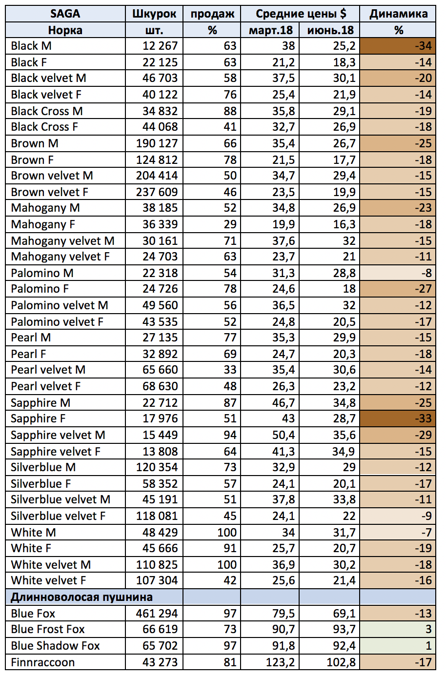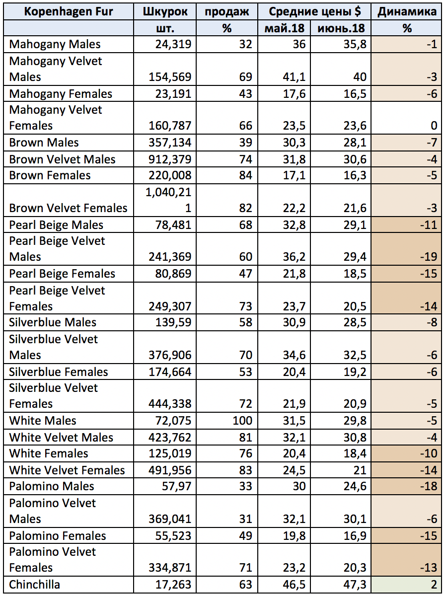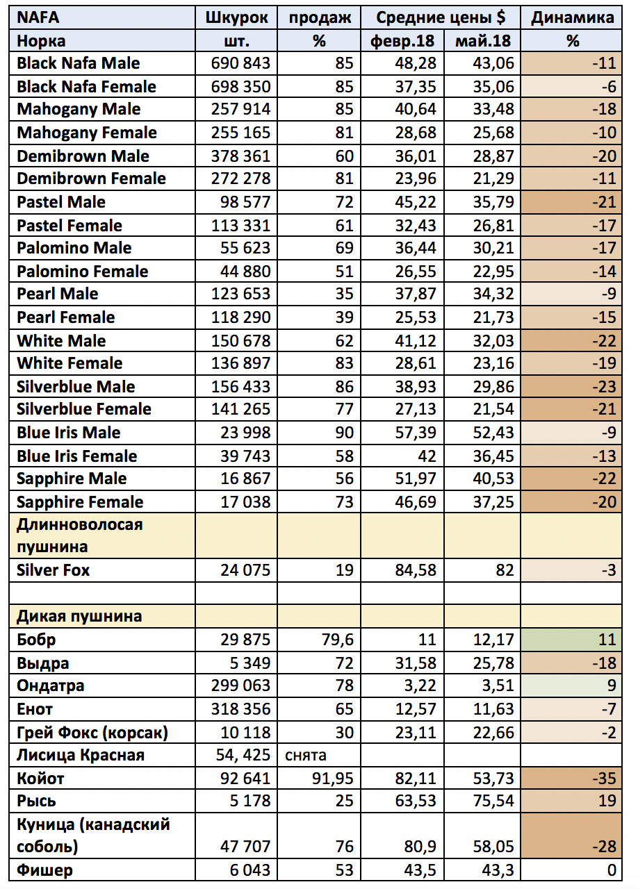 Начиная с января 2018 и заканчивая торгами в июне практически все международные аукционные торги демонстрировали волатильность спроса на основные виды пушнины, а также снижение цен на шкурки в среднем 10-15% от торгов до торгов. Хорошим спросом пользовались только некоторые редкие виды пушнины или редкие цветовые типы норок.