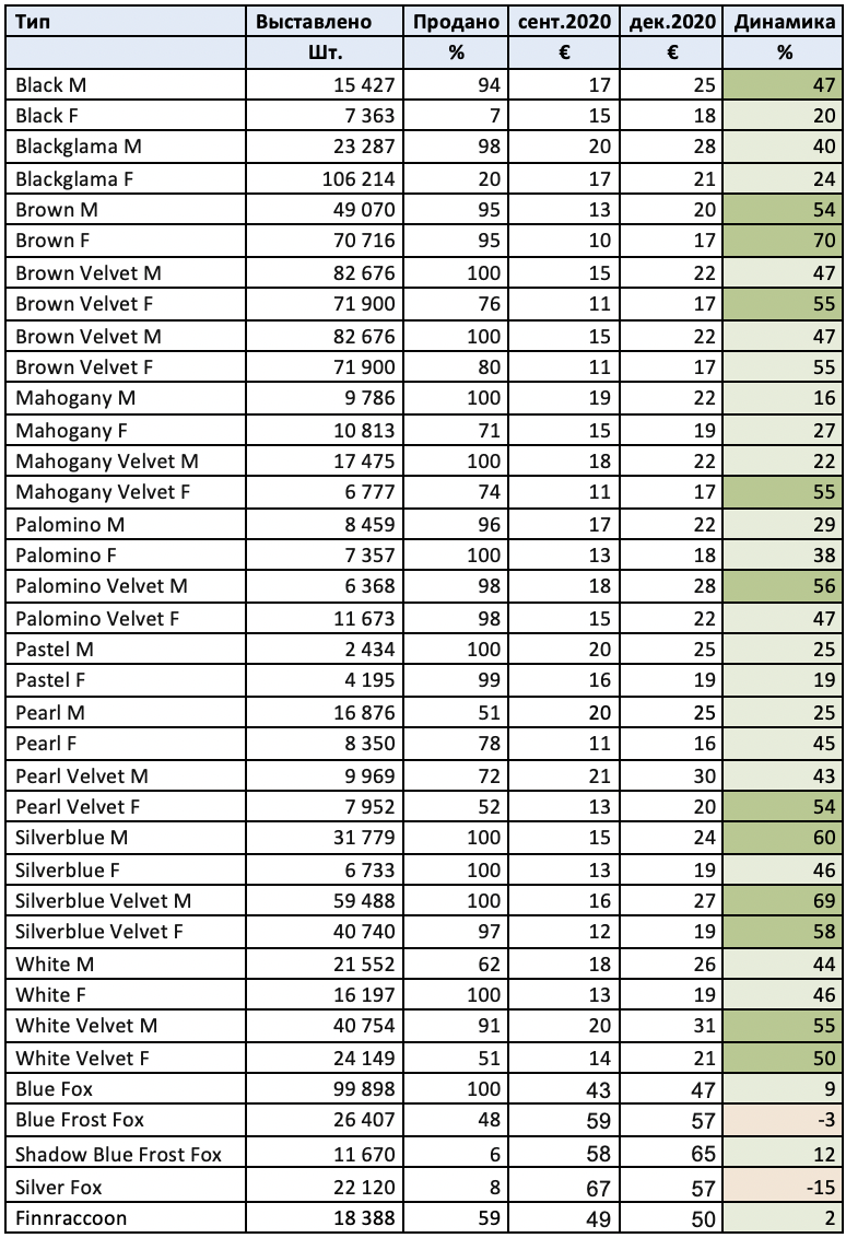 Ниже представлена сравнительная таблица по средним ценам на норку размеров 20 для самцов и 1 для самок и длинноволосую пушнину размеров 30 основных цветовых типов.