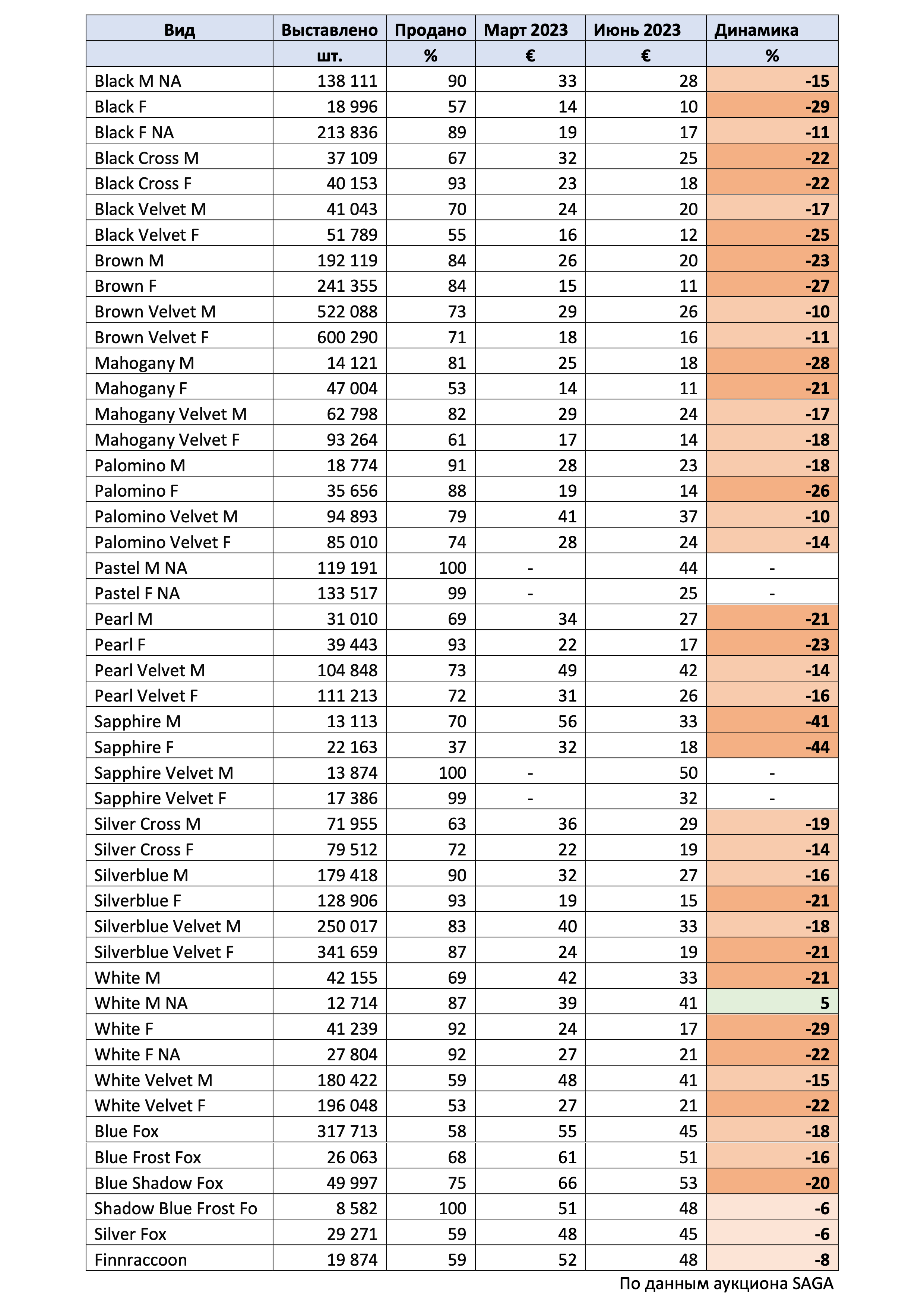 Ниже представлены данные по средним ценам на шкурки пушных зверей по сравнению с аукционом SAGA в марте 2022г.