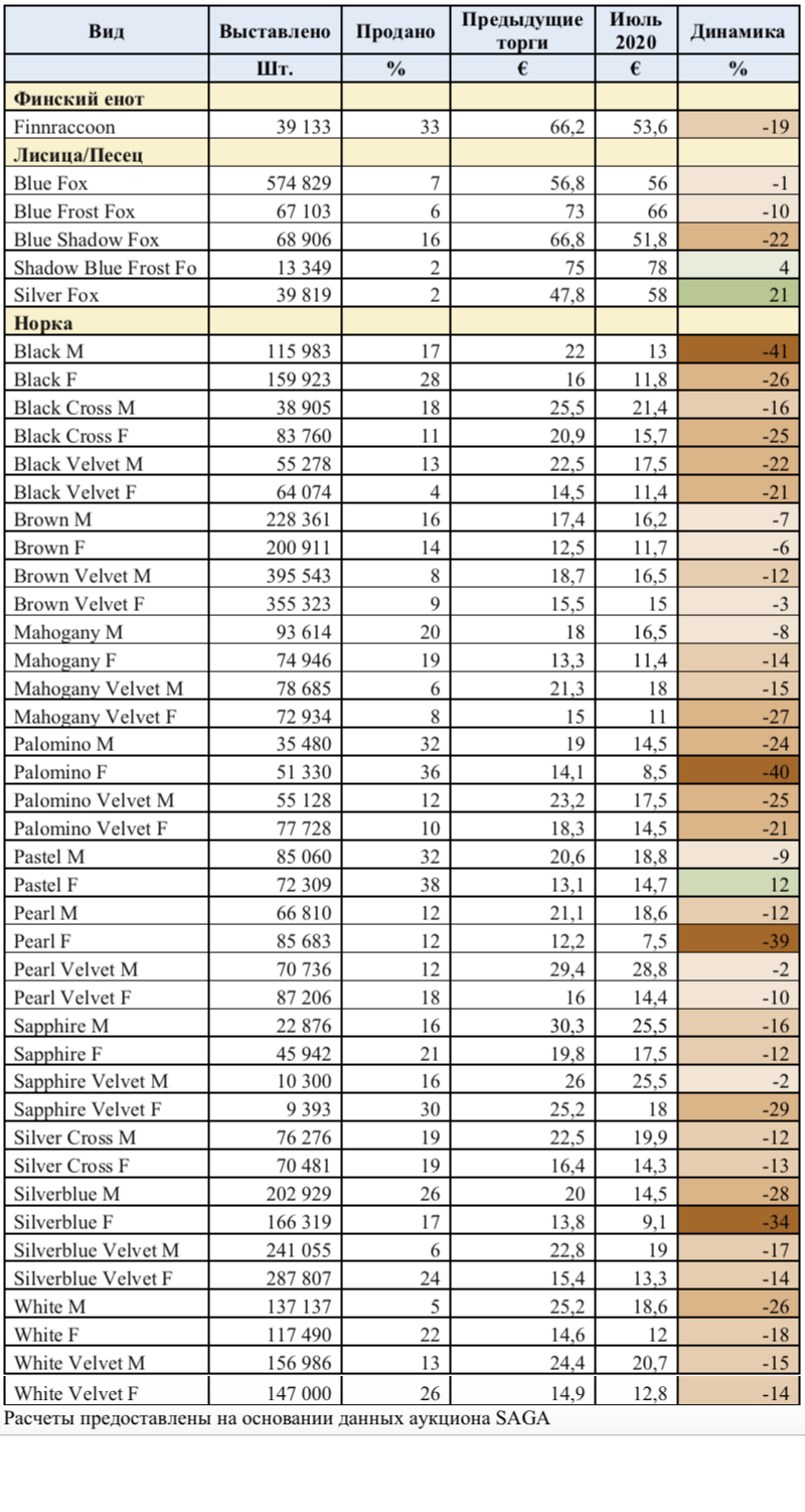 Для анализа динамики цен были взяты данные средних цен декабрьского 2019 и апрельского 2020 аукционов на норок и лисиц различных цветовых типов сорта Regular, самцов размера 00 и самок размера 1 для норок и 30/00 для лисиц, качества опушения SAGA, со средним тоном окраса шкурки.
