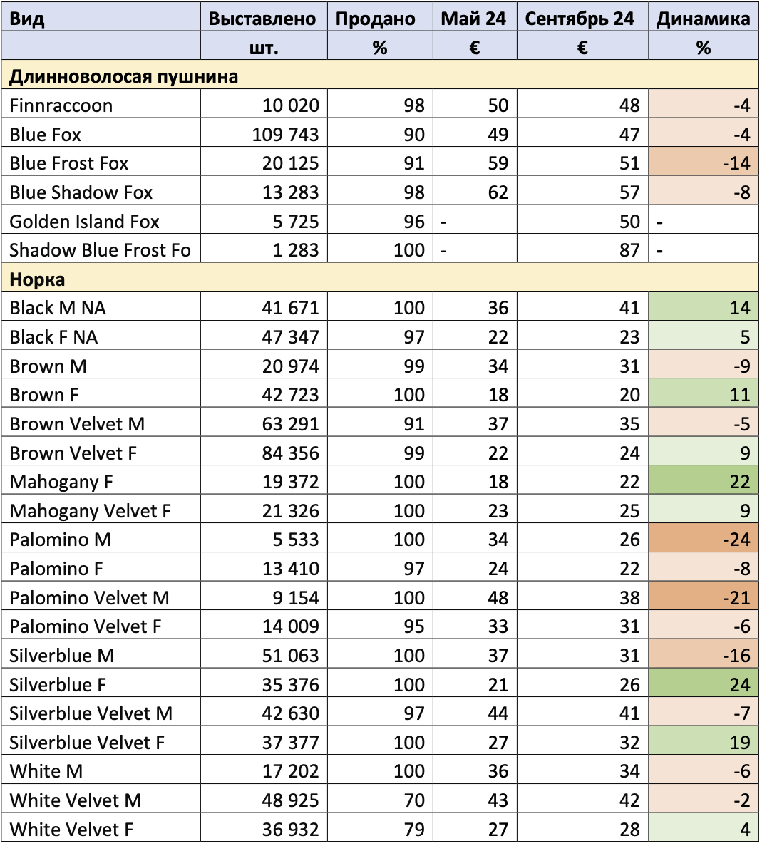 Из 3,5 миллионов шкурок норки, представленных на выставке, было продано 95%. Из 277 тыс. шкурок лисиц, песцов и финского енота было продано 90 %. Как правило, на сентябрьском аукционе значительная часть предложения состояла из шкурок низкого качества. С сентября 2023 года средняя цена шкурок норки выросла примерно на 30 %. Цены на шкурки лисиц, песцов и финского енота продолжают оставаться под влиянием слабого спроса на рынке.