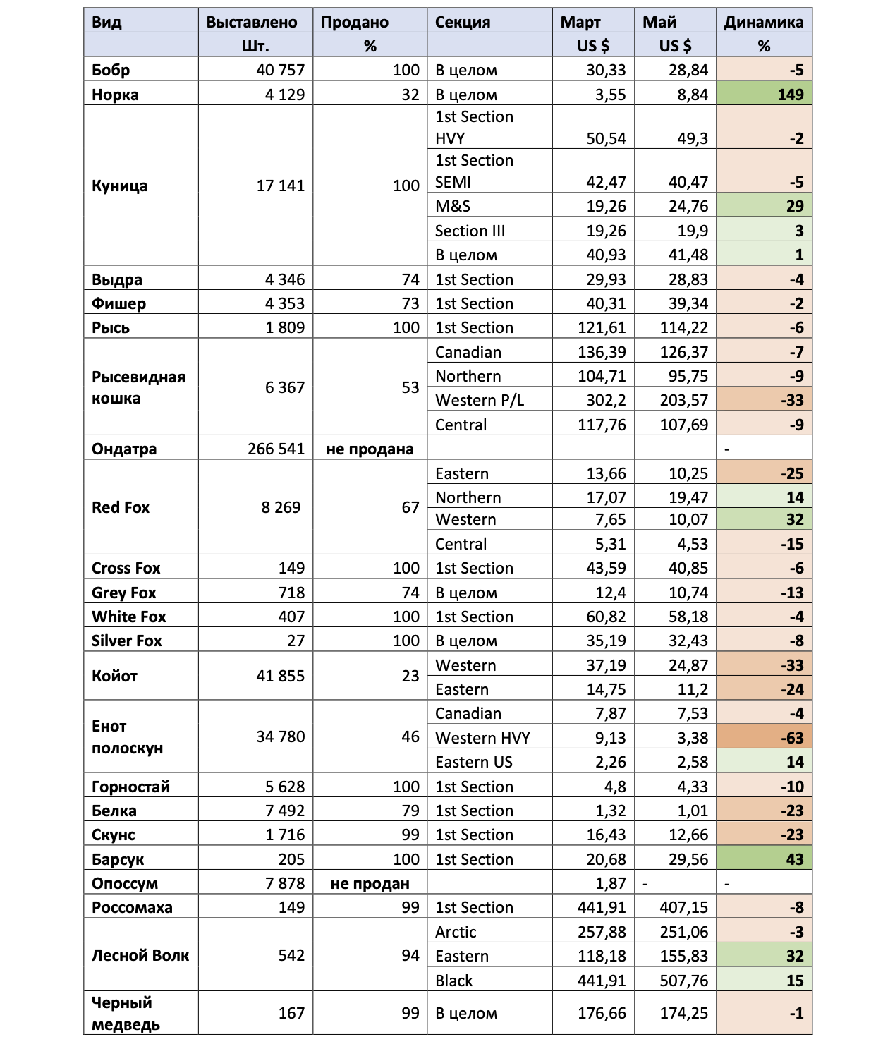 Ниже представлена сравнительная таблица средних цен на дикую пушнину в марте и мае 2023 г. по данным аукциона Fur Harvesters.