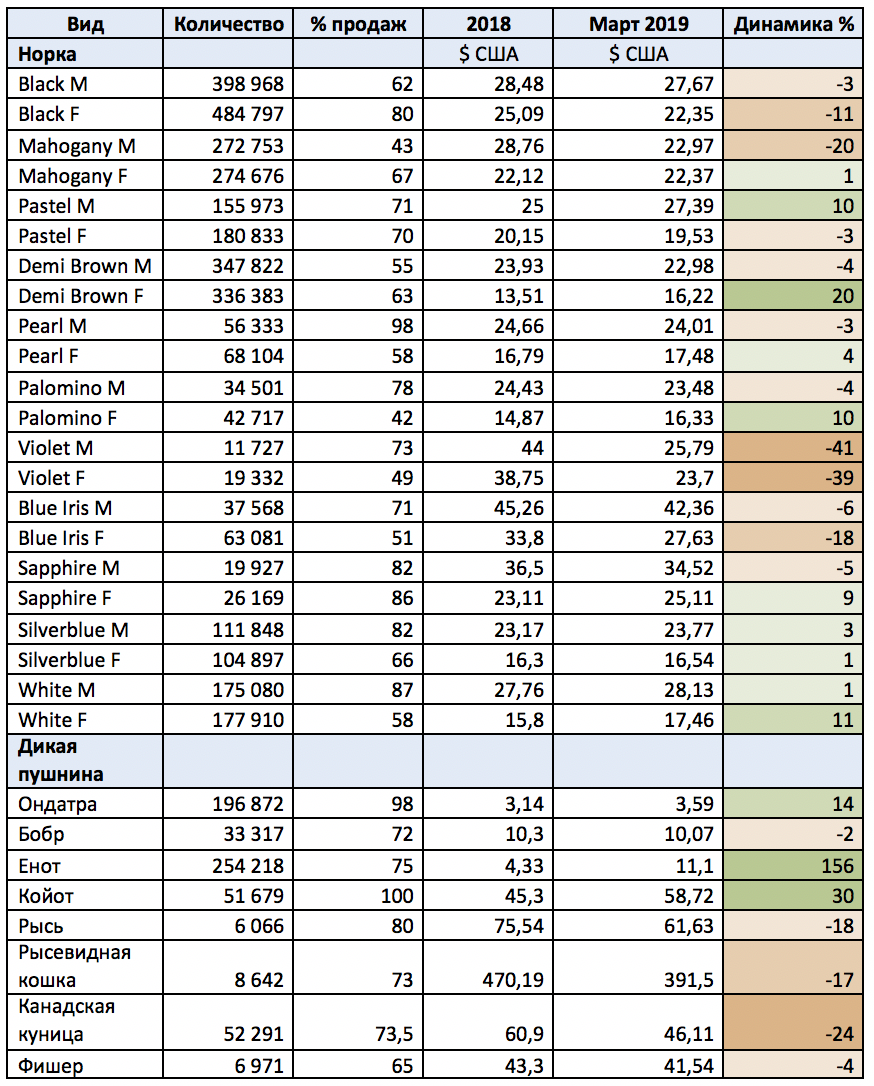 Ниже приведен анализ средних цен на шкурки различных видов пушных зверей средних размеров и показателей качества, согласно сортировке NAFA.