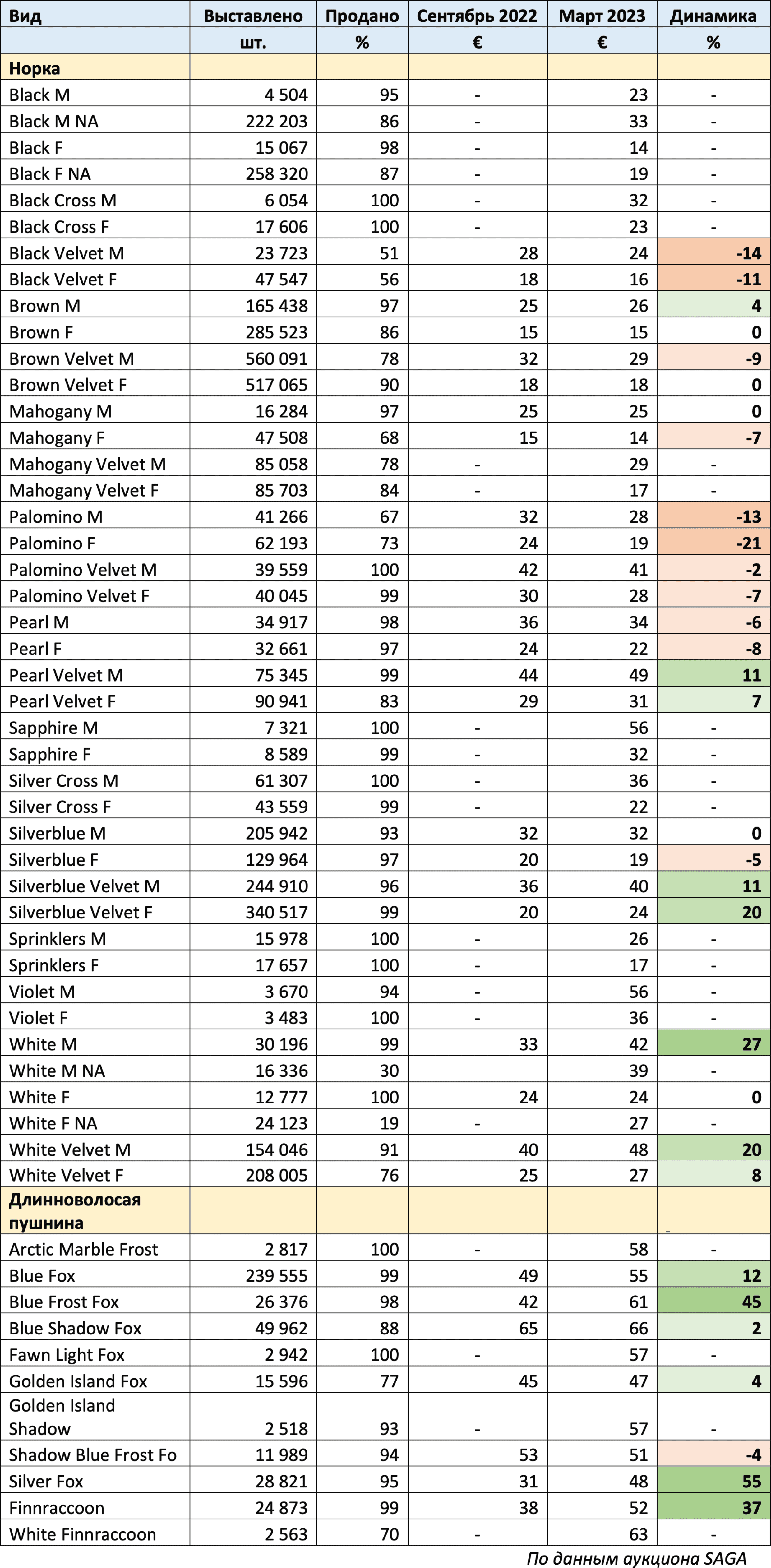 Ниже представлены данные по средним ценам на шкурки пушных зверей по сравнению с аукционом SAGA в сентябре 2022г.