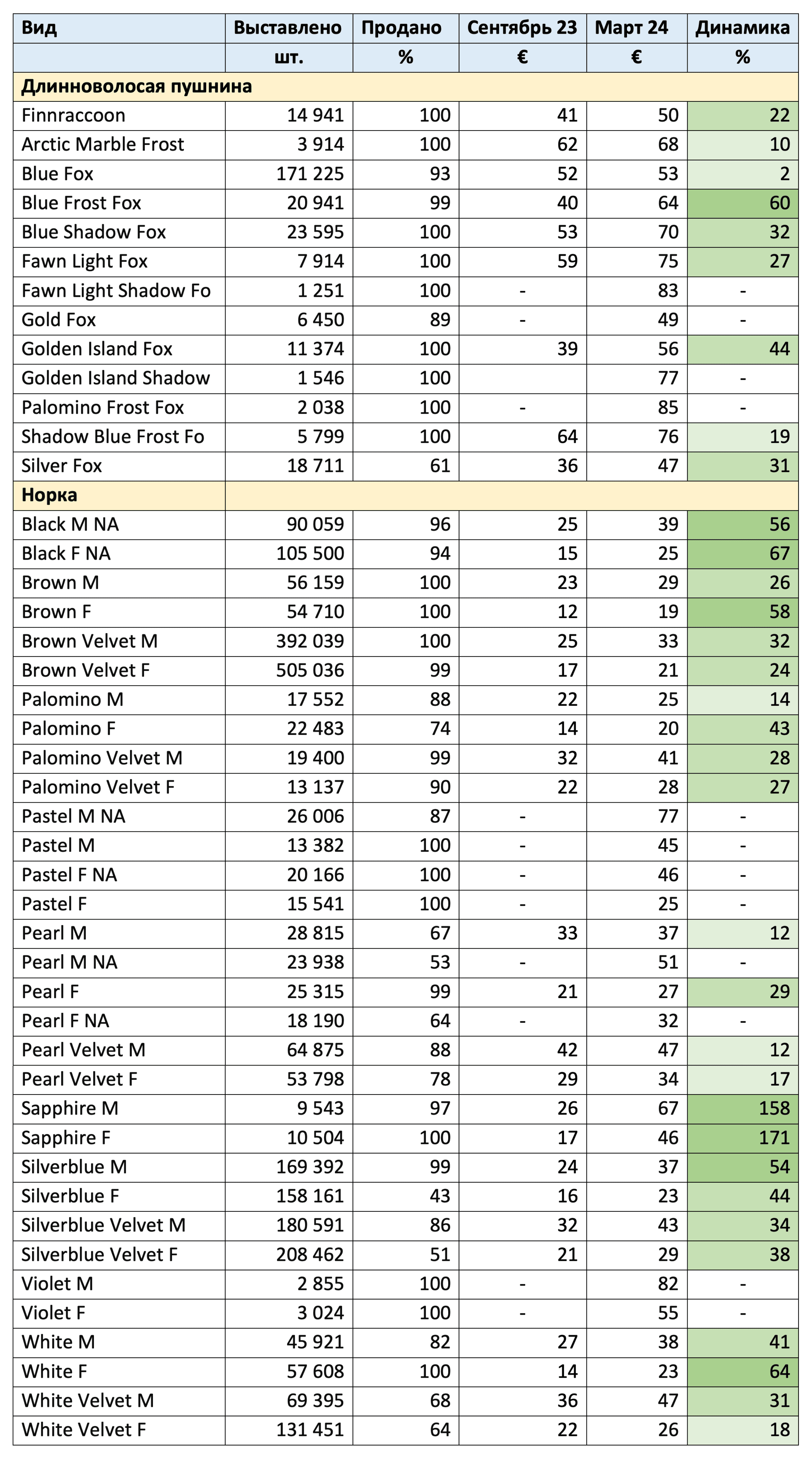 По сравнению с соответствующим аукционом прошлого года было предложено на 40 % меньше шкурок норки и почти на 30 % меньше шкурок лисицы и финского енота. Шкурки песца уже были проданы на дополнительном аукционе в декабре. На мартовском аукционе было продано почти 90 % из 325 000 шкурок лисицы и енота и 3 млн шкурок норки. Уровень цен на лисицу и енота был на 15%, а на шкурки норки в среднем на 25% выше, чем в прошлом году.