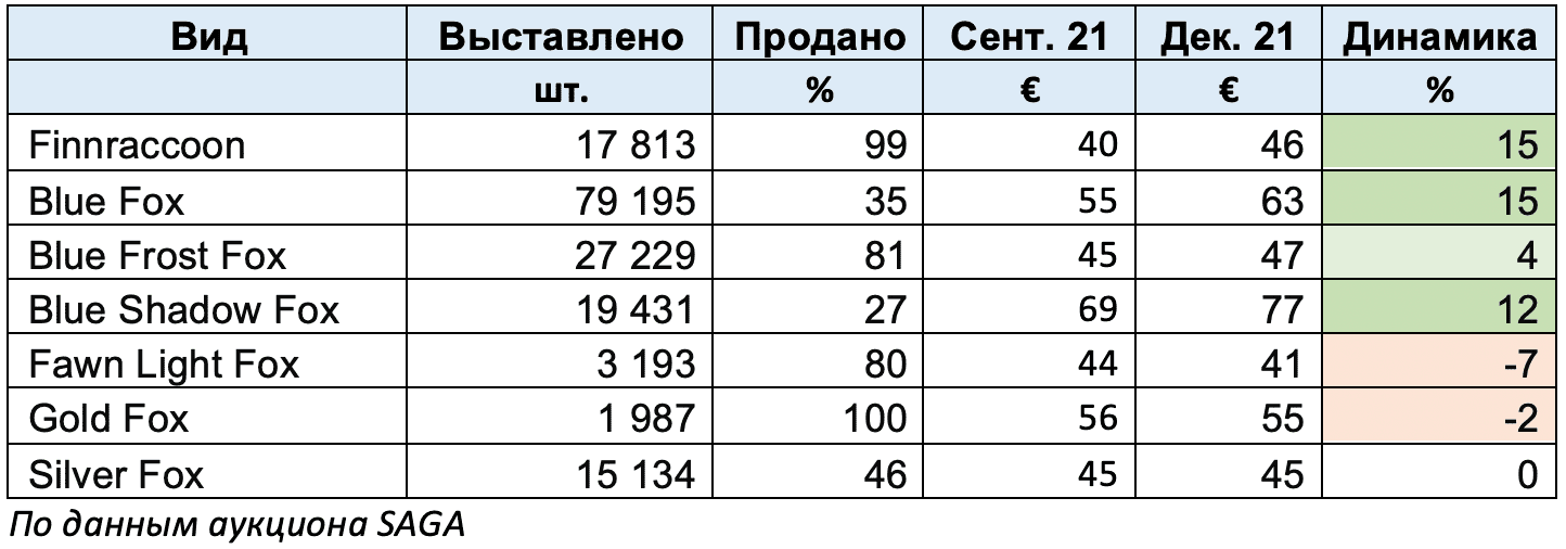 Шкурки голубого песца были реализованы почти на 40% при твердой ценовой политике. Blue Frost и некоторые мутационные виды лисиц достигли высоких уровней продаж.