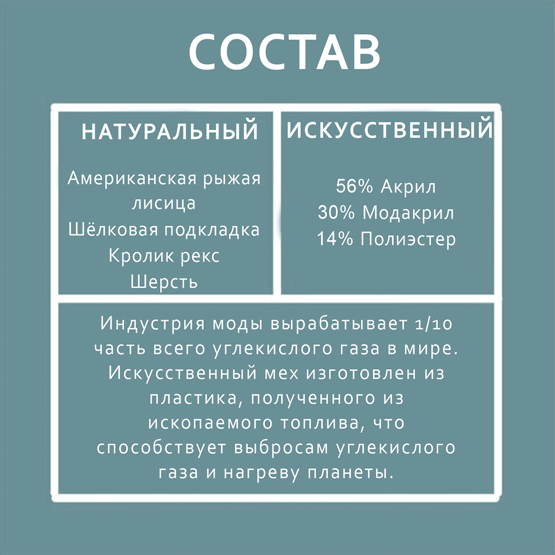 Мы призываем всех читателей свободно использовать наши заранее подготовленные посты в Instagram. Они представляют собой посты, которые сначала иллюстрируют одежду из натурального меха рядом с одеждой из искусственного меха, а затем, после пролистывания, предлагают шокирующие факты и цифры, касающиеся последствий создания и использования материалов из искусственного меха. Цель этих сообщений - перевоспитать своих подписчиков и распространить информацию, которую мы отчаянно пытаемся донести: акрил, модакриловые полимеры и полиэстер (все из которых являются ключевыми компонентами искусственного меха) в конечном итоге получены из нефти и других производных нефти. Все они способствуют выбросу CO2, что приводит к загрязнению окружающей среды, а значит, к разрушению и опустошению нашей планеты, и поэтому не являются безопасной или приемлемой альтернативой натуральному меху.