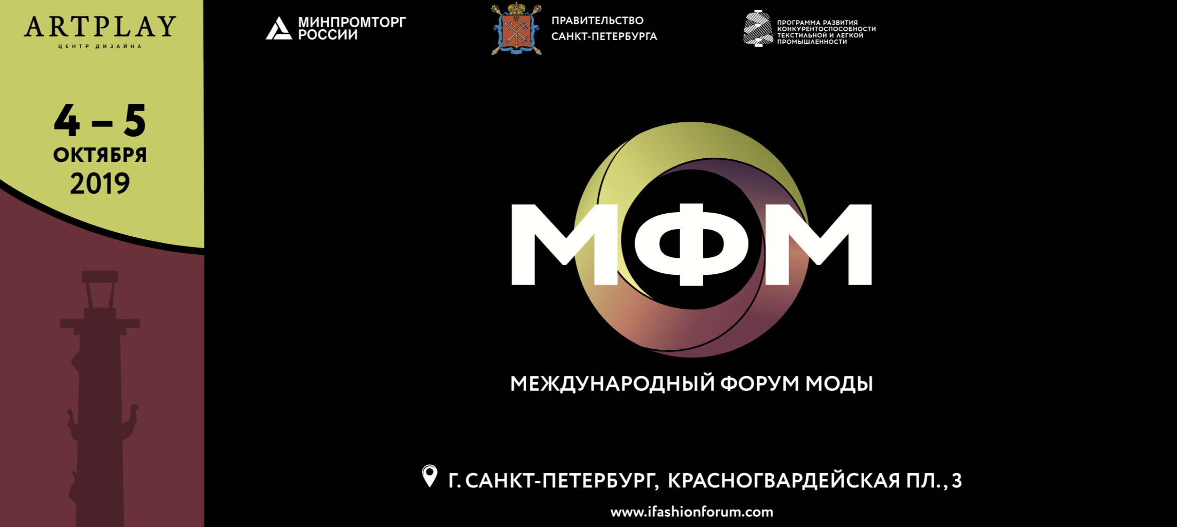 Департамент легкой промышленности и лесопромышленного комплекса Министерства промышленности и торговли Российской Федерации (далее – Департамент) сообщает, что III-й Международный Форум Моды состоится в Центре дизайна ARTPLAY SPb (г. Санкт-Петербург, Красногвардейская площадь, 3Е) и пройдет в период с 4 по 5 октября 2019 г.