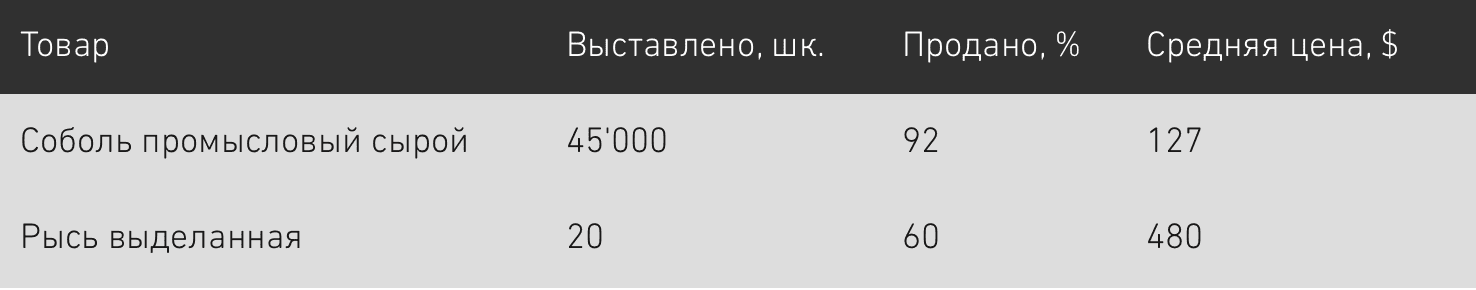 Коллекция промыслового соболя была реализована на 92% по средней цене 127$ за шкурку.