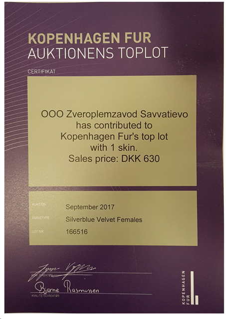 Шкурка норки, произведенная в зверохозяйстве Савватьево попала в топ лот международного аукциона в г. Копенгаген. Шкурка самки серебристо-голубой норки длина ости velvet, размера 0, качества "purple", тон "medium" была продана за 630 датских крон или 85 евро.