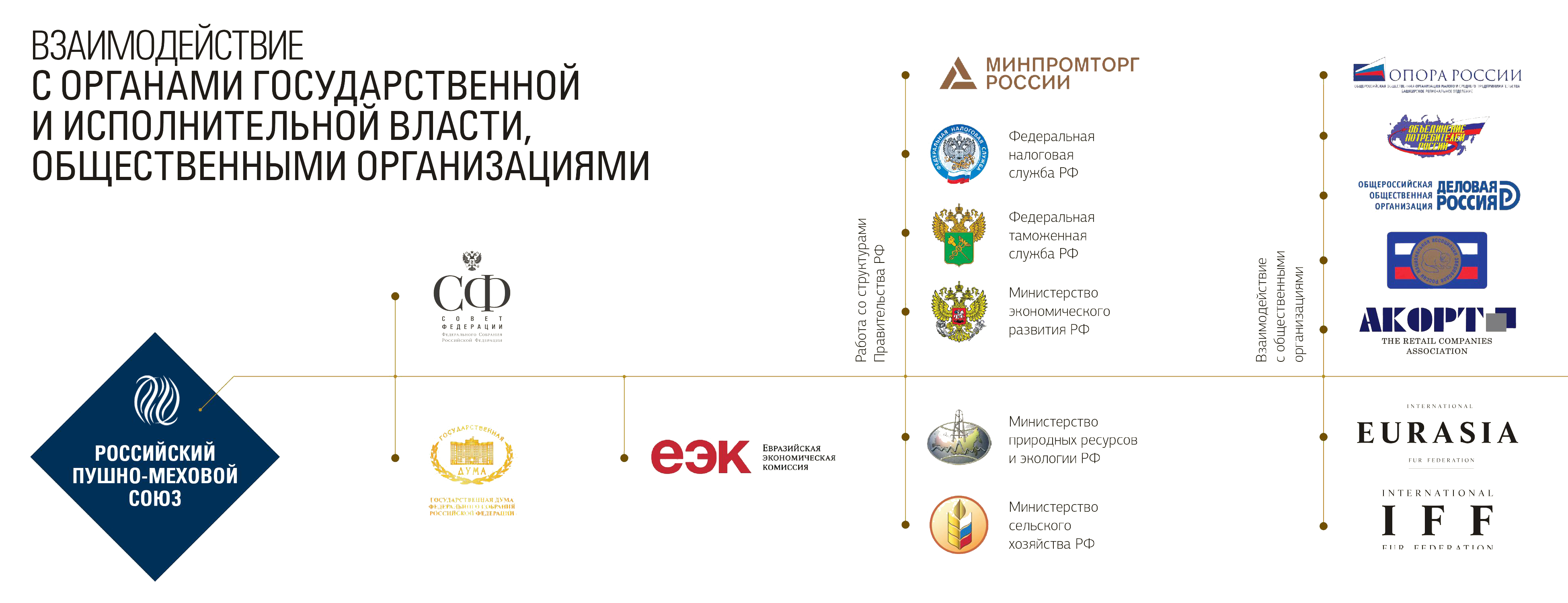 Союз является единственным в России профессиональным объединением, интегрированным в международное сообщество профессионалов, которое насчитывает в своих рядах 56 организаций из 44 стран — основных производителей и продавцов пушно-меховой продукции.